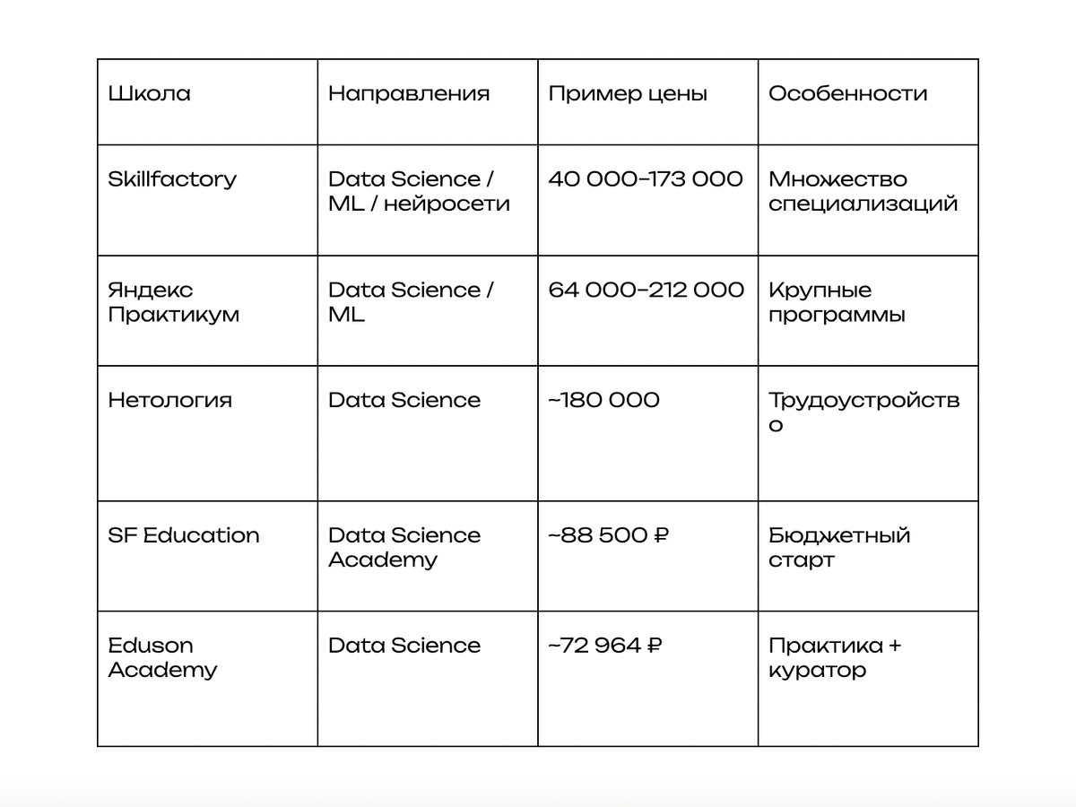 - Data Science Academy — около ~88 500 ₽ (иногда скидки до ~30 975 ₽)