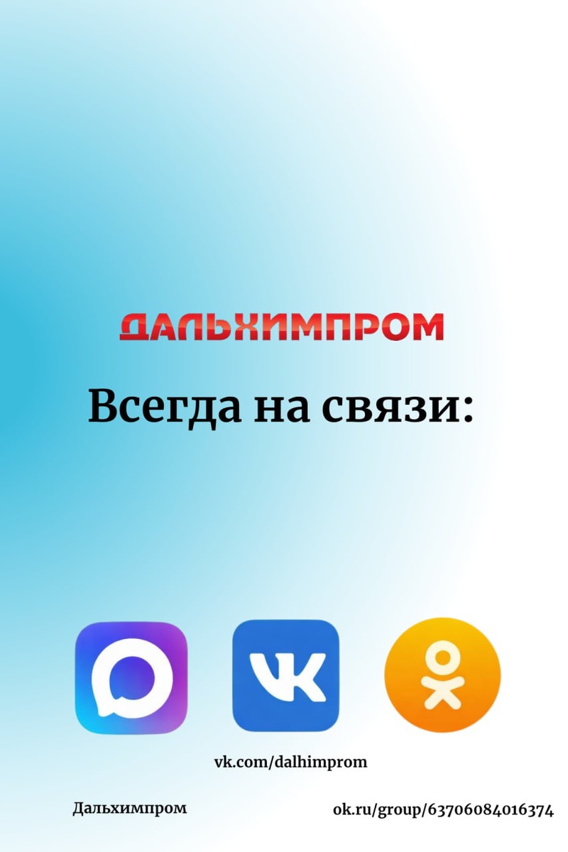 💙 Выбирайте удобную площадку и оставайтесь с нами — и здесь мы так же остаёмся на связи! 🔸 Одноклассники https://ok.ru/group/63706084016374 🔹 ВКонтакте https://m.vk.com/dalhimprom?from=groups 🔸 MAX https://max.ru/join/_W5a9n0NT0I7eibq-6ocGtsuTLpKu-zhKDABsEua7yM Пишите, задавайте вопросы, следите за новостями и акциями — мы рядом и готовы помочь 🤝