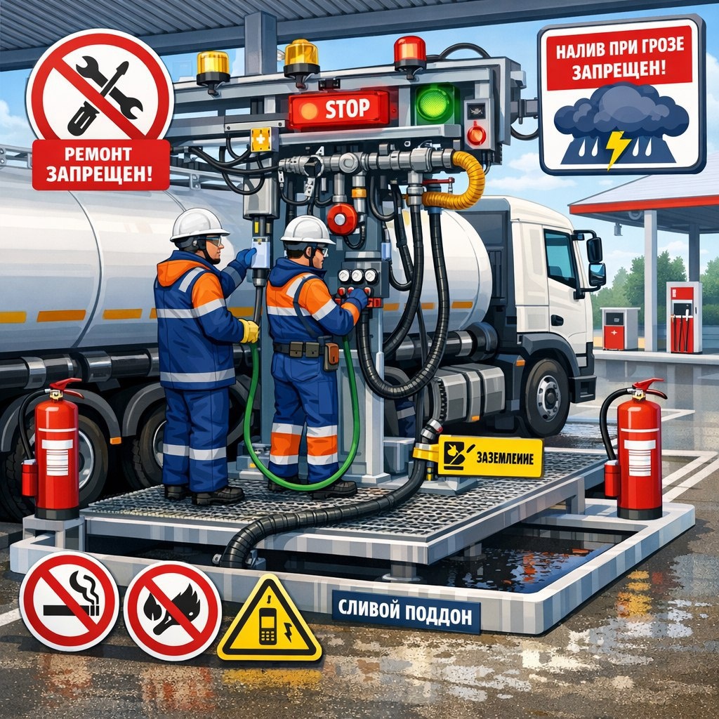 Нормативная база: ПОТ № 915н (16.12.2020), ППР № 1479 (16.09.2020), ГОСТ Р 58404-2019. ✅ Основные требования • Эстакада чистая, без льда/снега, посыпана противоскользящим составом (наледь удалять искробезопасным инструментом) — п. 68 ПОТ, п. 8.1.2 ГОСТ. • Твёрдое покрытие с отводом разлива в сборник — п. 68 ПОТ. • Налив при заглушённом двигателе под контролем водителя и оператора — п. 69 ПОТ, п. 382 ППР. ⛔️ Запреты (п. 72 ПОТ) • Въезд/ремонт неисправных автоцистерн на эстакаде — подп. 1. • Налив при грозе и ветре ≥15 м/с — подп. 2. • Налив без подключения к заземлению — подп. 3. • Пребывание в кабине во время налива — подп. 4. • При разливе: заглушить двигатель, отбуксировать тросом/штангой — подп. 5 п. 72 ПОТ, п. 391 ППР. 🚨 Оборудование • Сигнализаторы довзрывных концентраций, блокировка операций, оповещение о запрете запуска ДВС — п. 73 ПОТ. • Открывать люки с наветренной стороны — п. 79 ПОТ. ⚡️ Заземление • Подключать к заземлению ДО начала слива по инструкции — п. 80 ПОТ. • Не