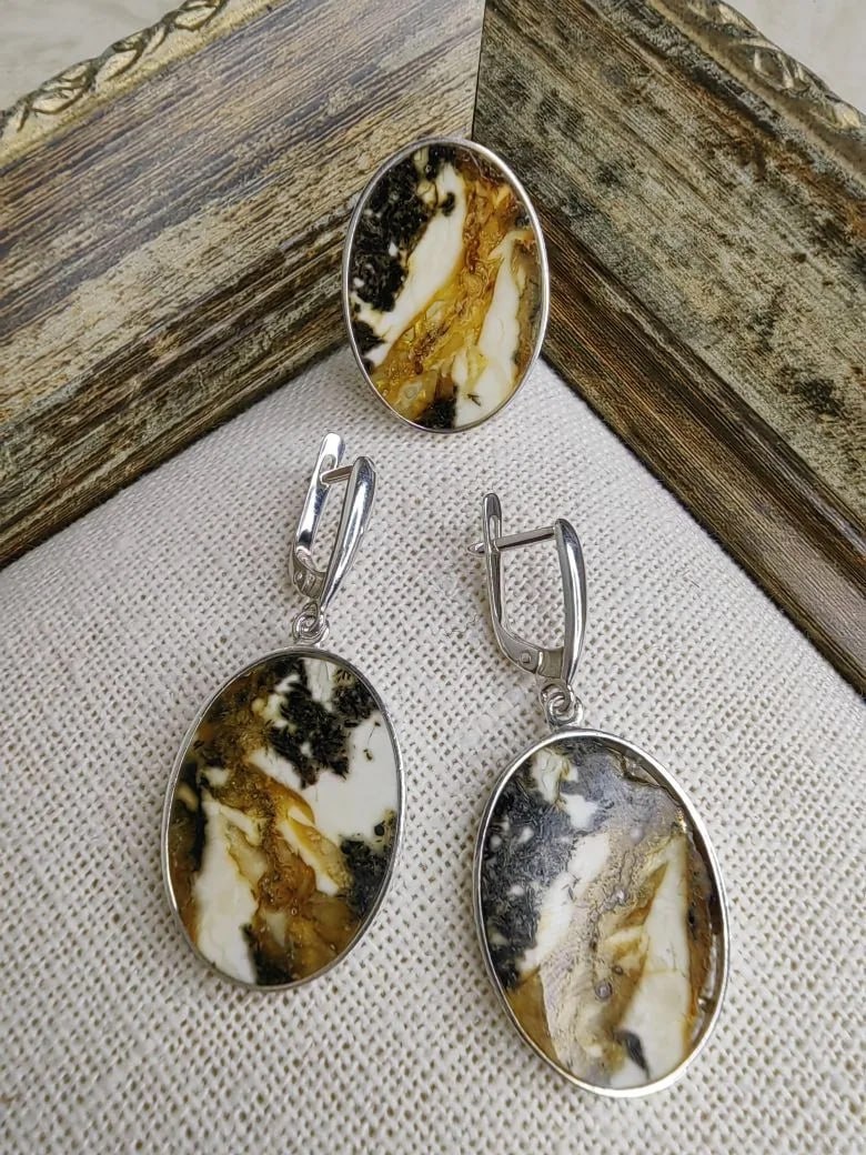 Серьги 15250 Серебро 925, природный пейзажный янтарь.
