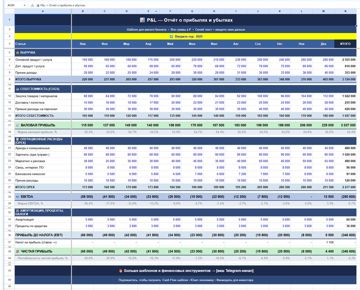 Если ты ведёшь бизнес и до сих пор считаешь прибыль «на глазок» — выручка минус то, что помнишь из расходов — эта статья для тебя. Я сделал бесплатный шаблон P&L (Profit & Loss — отчёт о прибылях и убытках), который можно скачать и за 5 минут подставить свои цифры. Всё считается автоматически: валовая прибыль, EBITDA, чистая прибыль, маржи. Ниже покажу, что внутри и как пользоваться. P&L — это таблица, которая показывает, сколько бизнес заработал, сколько потратил и сколько осталось. Не «примерно», а с точностью до рубля, по каждому месяцу. Без P&L ты не видишь: С P&L — видишь всё. И можешь принимать решения на основе цифр, а не ощущений. Что внутри шаблона Шаблон разбит на логичные блоки: Выручка — сюда вписываешь доходы по каждому направлению. Есть строки для основного продукта, дополнительных услуг и прочих доходов. Итог считается автоматически. Валовая прибыль — выручка минус себестоимость. Это первый индикатор здоровья бизнеса. Если маржа ниже 20–30% для товаров или 40–50% для усл