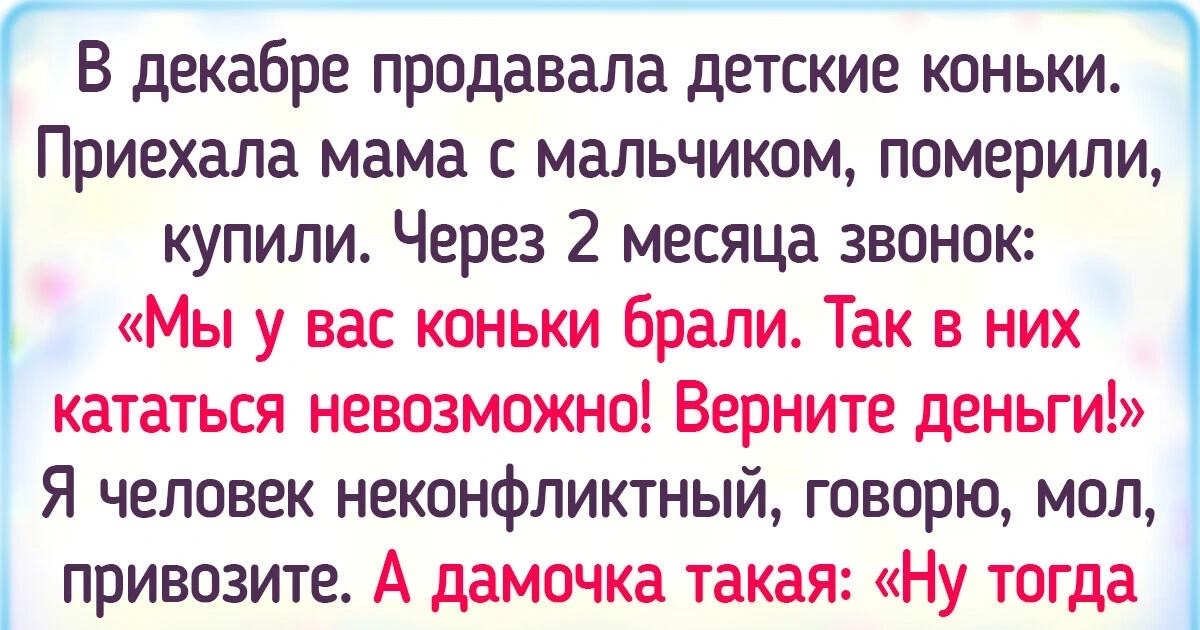 “В декабре продала детские коньки. Через два месяца звонят: кататься невозможно, верните деньги. Я сказала — привозите. А мне в ответ: ну тогда мы еще пару раз на каток сходим и привезем. Тут я уже не выдержала.”