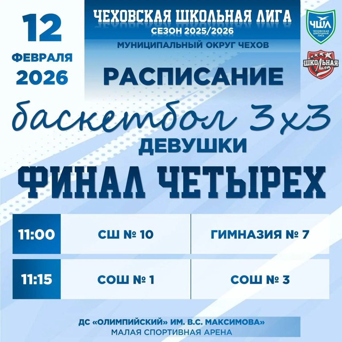 ✨ Чеховская школьная лига. Баскетбол 🏀 Сегодня соревнуются девушки 3х3. 📆 12.02.2026 🏢 ДС «Олимпийский» им. В. С. Максимова 📍 г. Чехов, ул. Полиграфистов, стр.30 🪙 Вход свободный❗️ ⭐Поддержать канал голосом ✅ Мероприятия Чехов https://dzen.ru/id/66cc4b48e9ef144699238a51 http://vk.com/chekhov_events http://dzen.ru/chekhov_events