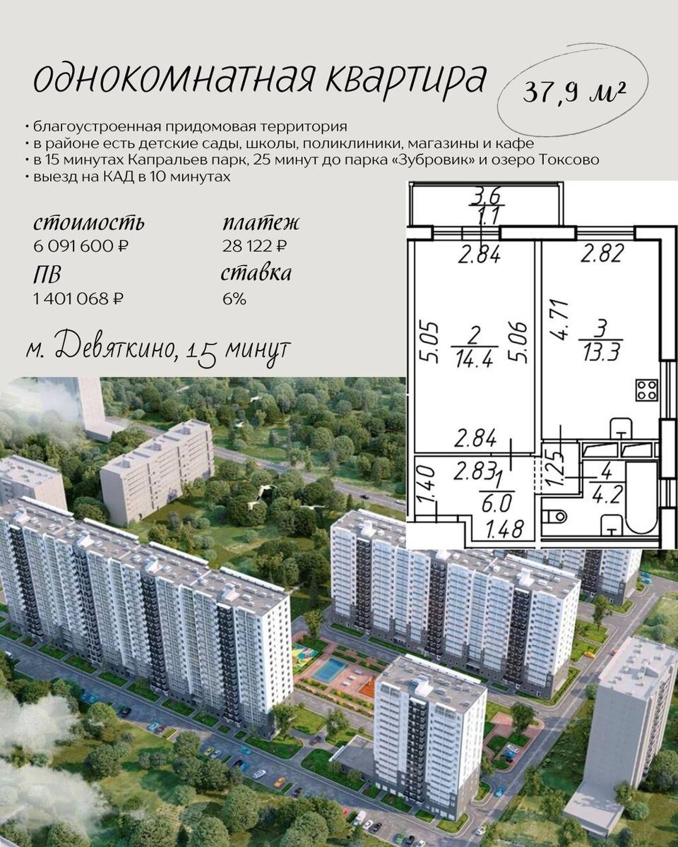 кухней, окном в ванной и функциональным коридором 🚇 Транспортная доступность: всего 15 минут до метро «Девяткино» 🤩стоимость квартиры 6 091 600 ₽ 🤩семейная ипотека под 6% 🤩первоначальный взнос 1 401 068 ₽ 🤩ежемесячный платеж 28 122 ₽ Заинтересовало предложение? 📧 Напишите нам нажав на 🏠 наш менеджер даст подробную информацию ➡️ Вы так же можете перейти в наш бот @eon_bot