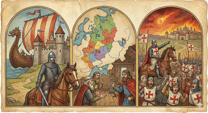 Первый Крестовый поход (1096–1099): Европа впервые объединилась ради общей цели (хоть и кровавой). Иерусалим наш (ну, то есть их), созданы государства крестоносцев.