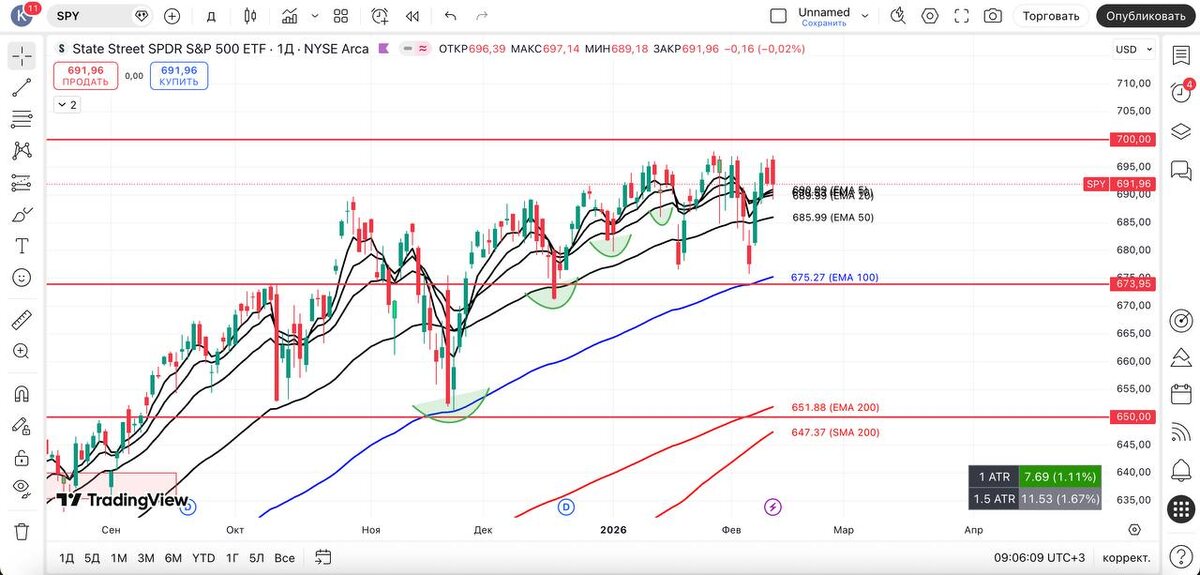 Остается такая же задача для техов $QQQ, $IXIC, $XLK, $MAGS — пробить скользящие сверху на дневном графике. Также важно удержать 20 EMA W. И в данный момент $MAGS выглядит очень слабо — и может опуститься к 200 EMA D - SMA D + удлинённые ротационные отрасли: $DIA, $NYA, $RSP и полупроводники $SMH = не исключаем красные дни, и продолжаем наблюдать за $ES1!, который в очередной раз показывает реакцию на 7 000$, а $VIX — без явных подсказок. Вот такая реальность трейдинга: 80% времени мы выцеливаем цель. #spy #технический_анализ #америка #трейдинг_сша #фондовый_рынок #обзор #вывод #qqq #vix #smh #mags #xlk #ixic