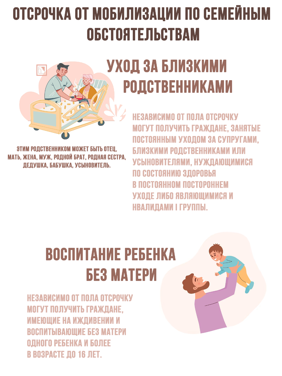 любые документы, подтверждающие, что другие лица, на которых закон возлагает обязанность по содержанию родственника, не могут принять на себя обязанность по осуществлению ухода. Документы, которые помогут подтвердить наличие основания для отсрочки при воспитании ребенка без матери: единый жилищный документ, подтверждающий состав семьи;