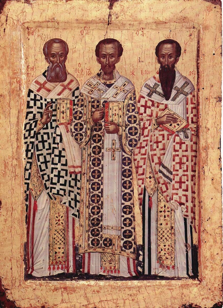 каппадокийцев Василия Великого, Григория Богослова и Иоанна Златоуста. Тропарь, глас 4 Я́ко апо́столов единонра́внии/ и вселе́нныя учи́телие,/ Влады́ку всех моли́те/ мир вселе́нней дарова́ти// и душа́м на́шим ве́лию ми́лость. Перевод: Апостолам единомысленные и вселенские учители, Владыку всего молите мир вселенной даровать и душам нашим великую милость. Праздник установлен, чтобы пресечь споры о первенстве кого-либо из этих Отцов церкви. По церковному преданию, в 1084 году митрополиту Евхаитскому Иоанну явились вместе три святителя и повелели установить общий день празднования их памяти, объявив, что они равны пред Богом. Подробнее можно прочитать здесь.