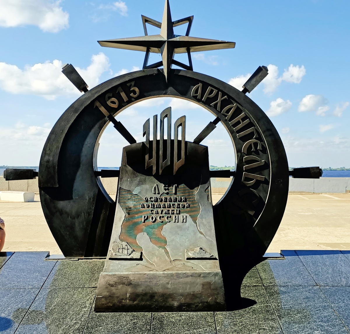 Визитная карточка города встречает гостей у воды. Стройная стела, увенчанная гранитным "носом ладьи" и старинным компасом, словно приглашает в плавание. Это символ устремлённости, памяти о тех, кто уходил в полярные экспедиции и возвращался с победой.