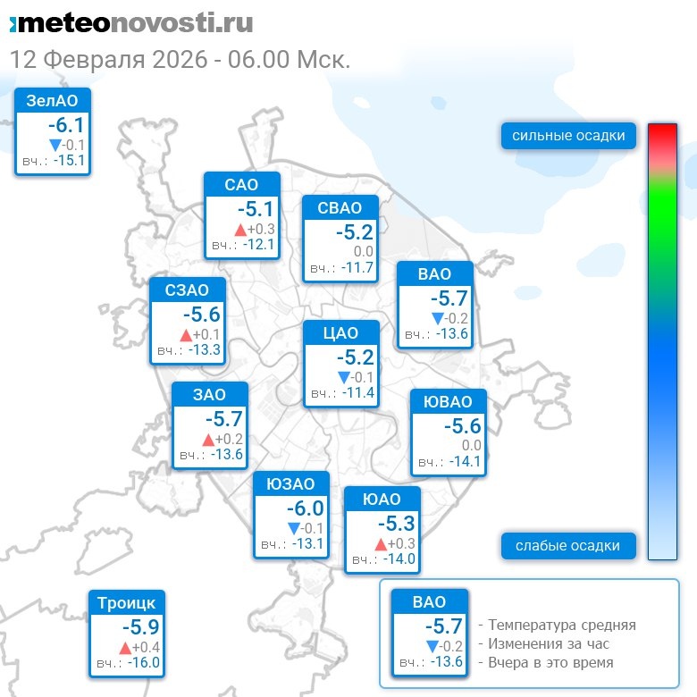 В 6:00 в Москве было от -6.2°C до -4.9°C, средняя температура -5.4°C #погода #Москва #зима #температура #12февраля #четверг