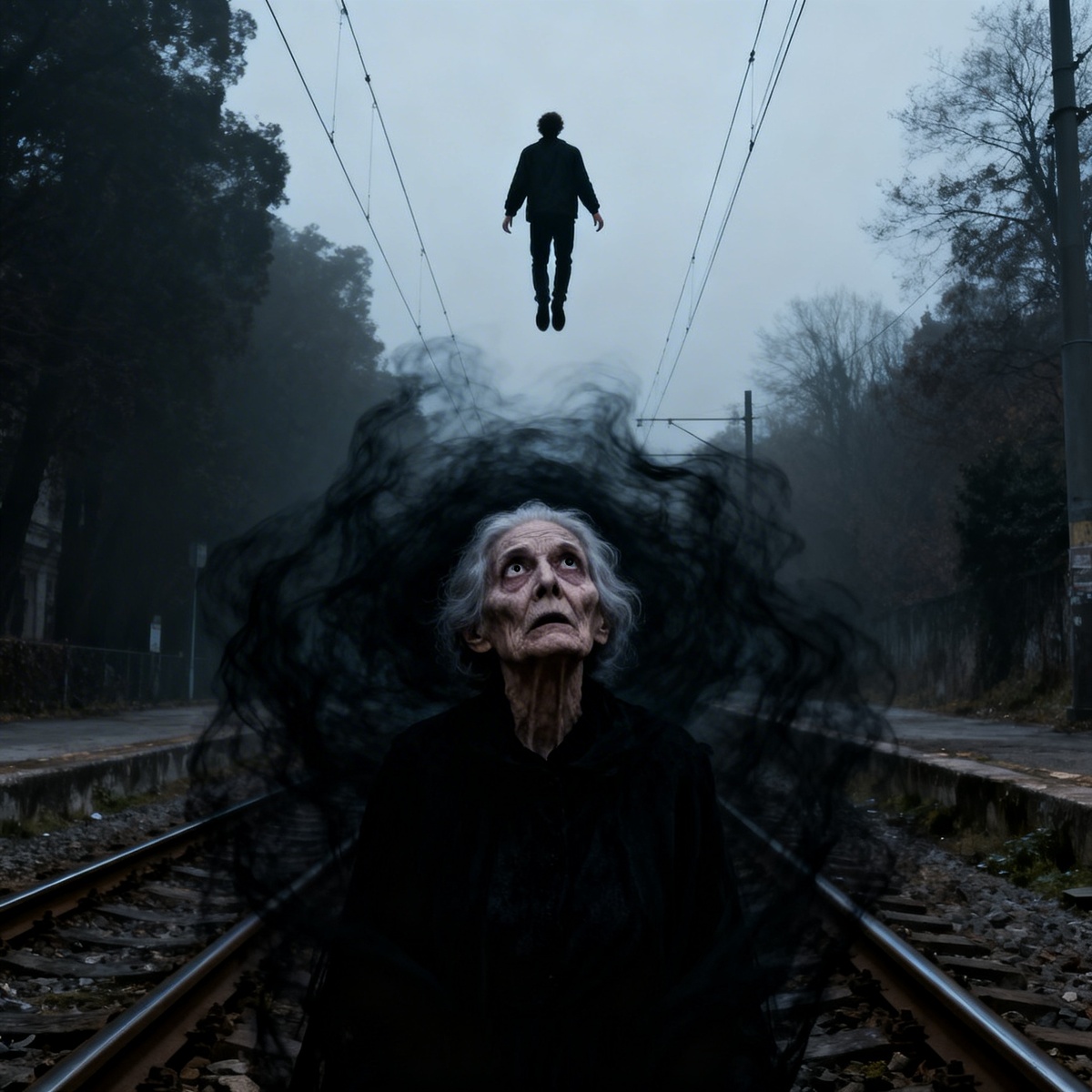 — Старуха, — ответил Хенаро. — Та самая, с чёрной аурой. Которая смотрела на тебя, когда ты летел над трамвайной линией. В 1992 году.