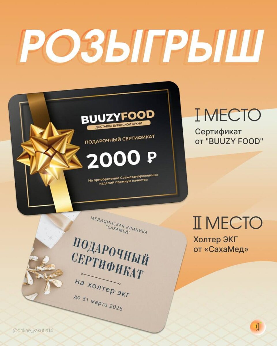 ⏰ Напоминаем про розыгрыш Вы ещё успеваете принять участие и забрать один из двух полезных и вкусных призов 💫 🎁 Что разыгрываем? 1️⃣ Сертификат на 2000 ₽ от BUUZY FOOD на сочные бузы, пельмени «Баргжа», хрустящие хушууры и другие вкусняшки 🤤 🚚 Доставка бесплатная! 2️⃣ Холтер ЭКГ от клиники «СахаМед» Персональное устройство для суточного мониторинга сердца ❤️ Помогает выявить скрытые нарушения ритма, которые не всегда видно на обычной ЭКГ. 🗓 Итоги уже скоро: 13 февраля ⏰ 21:00 по Якутску 👥 Сейчас участвует: 88 человек 🏆 Победителей будет 2, шансы отличные Online Якутия | Ждем вас в МАХ