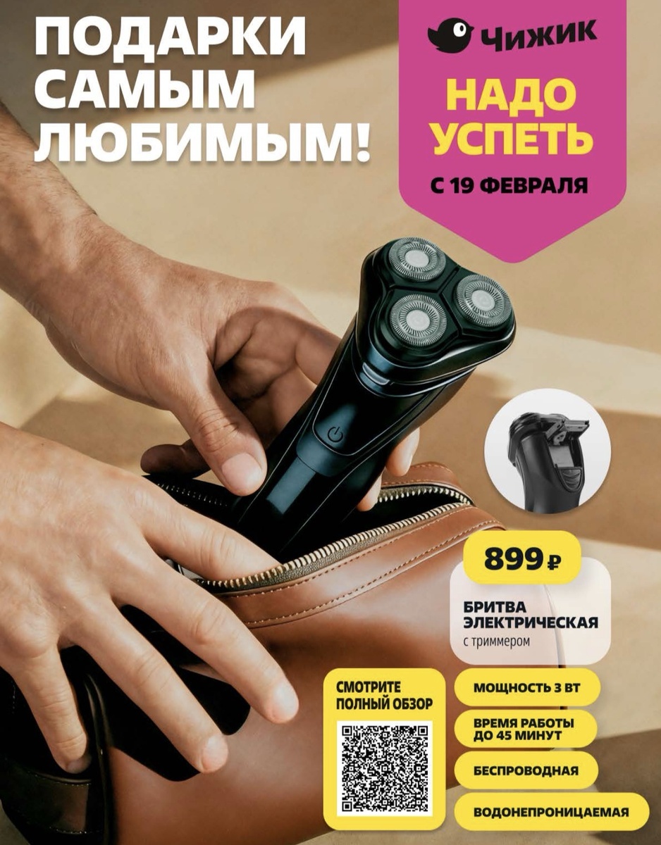 На обложке появилась электробритва с триммером. Она оснащена аккумулятором, водонепроницаемым корпусом и имеет мощность 3 Вт. Стоимость устройства составляет 899 рублей.
