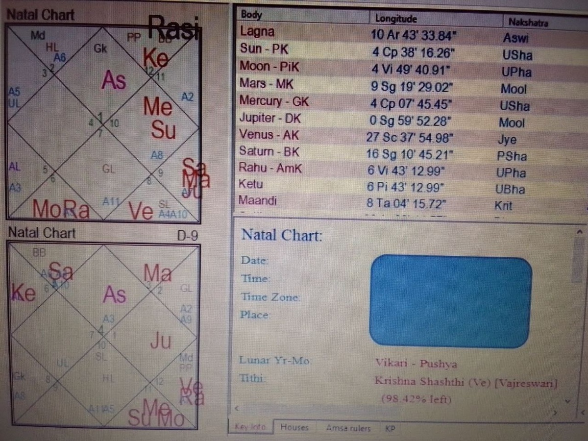 Диспозитор Луны и хозяин 6го Мерк и хозяин АЛ Солнце в 10м, всего в двух градусах от Абхиджит накшатры (6.40 Козерога – начало Абхиджит). Лагнеш Марс с Юпитером и Сатурном в 9м – успех на международном уровне. Вместе связаны хоз 1го (Марс), хозяин 10го (Сат) и хоз 9го (Юп). Это мощная Раджа-йога. Основной успех пришелся на период Марса (вовлеченного в Раджа-Йогу) и Раху. Раху – АмК в доме борьбы, в накшатре У.Пхалгуни (Солнце, хоз 5го). Венера – хозяйка ГЛ, ХЛ и находится в Шри Лагне в 8м - Успех с деньгами других людей (рэкет). С одной стороны, натив добился больших успехов, а, с другой стороны, в его карте есть Кала-Сарпа-Йога типа Махападма-кала-сарпа-йога (Раху в 6м-Кету в 12м), которая дает множество врагов, склонность к противозаконной деятельности (Луна+Раху= криминальный менталитет). Нативу пришлось эмигрировать и скрываться за границей в период Раху.