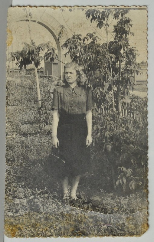 Фото. Коренева В.Г. у входной арки на ул. Кремлева. | 1949 - 1950 гг.