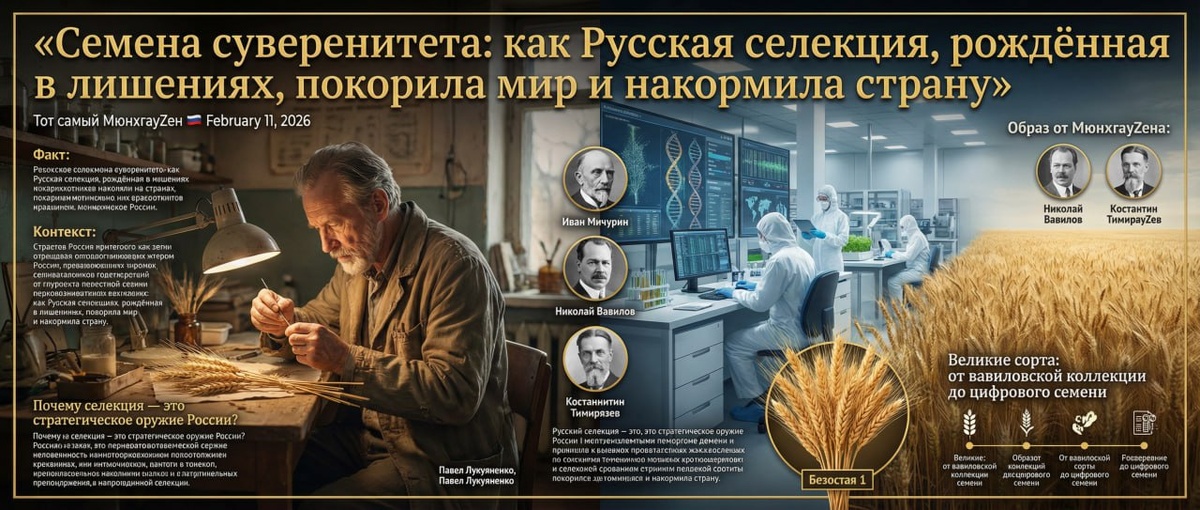🚨 Рубрика: «Исторический калейдоскоп» Цикл: «Развитие сельского хозяйства: От Рюрика до современности» 📅 Семена суверенитета: как Русская селекция, рождённая в лишениях, покорила мир и накормила страну - Часть 2️⃣/2 🎭 Образ от МюнхгауZена: Представьте себе две лаборатории. Первая — в Германии или США, стерильно-чистая, с дорогим оборудованием, где учёные в белых халатах работают с геномными картами. Вторая — в советском НИИ в послевоенные годы. В помещении сквозит, стекла дрожат от проходящих поездов, а учёный в поношенном пиджаке, при свете настольной лампы, часами вручную опыляет колосок за колоском, перенося пыльцу кисточкой. Он мечтает не о Нобелевской премии, а о том, чтобы через пять лет на бескрайнем целинном поле его пшеница стояла стеной и не ложилась под ветром. И именно из этой второй, аскетичной лаборатории вышел сорт, который перевернул мировое земледелие и накормил миллионы. В этом контрасте — вся суть русского научного подвига: не из комфорта и изобилия, а из нужды,