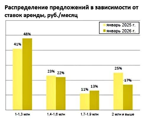 В январе 2026 года средняя ставка аренды жилья из «золотой сотни» Москвы снизилась до 1,62 млн ₽ в месяц. Самая доступная квартира из топ-100 сдаётся за 1 млн ₽, самая дорогая — за 9 млн ₽ в месяц. 🔵Причина — «вымывание» крупных и самых качественных лотов в конце 2025 года. ⬇️Активные семейные арендаторы забрали просторные квартиры с новым ремонтом. В результате средняя площадь объектов в рейтинге сократилась на 10% — до 256 м², а доля квартир меньше 200 м² выросла с 32% до 48%.