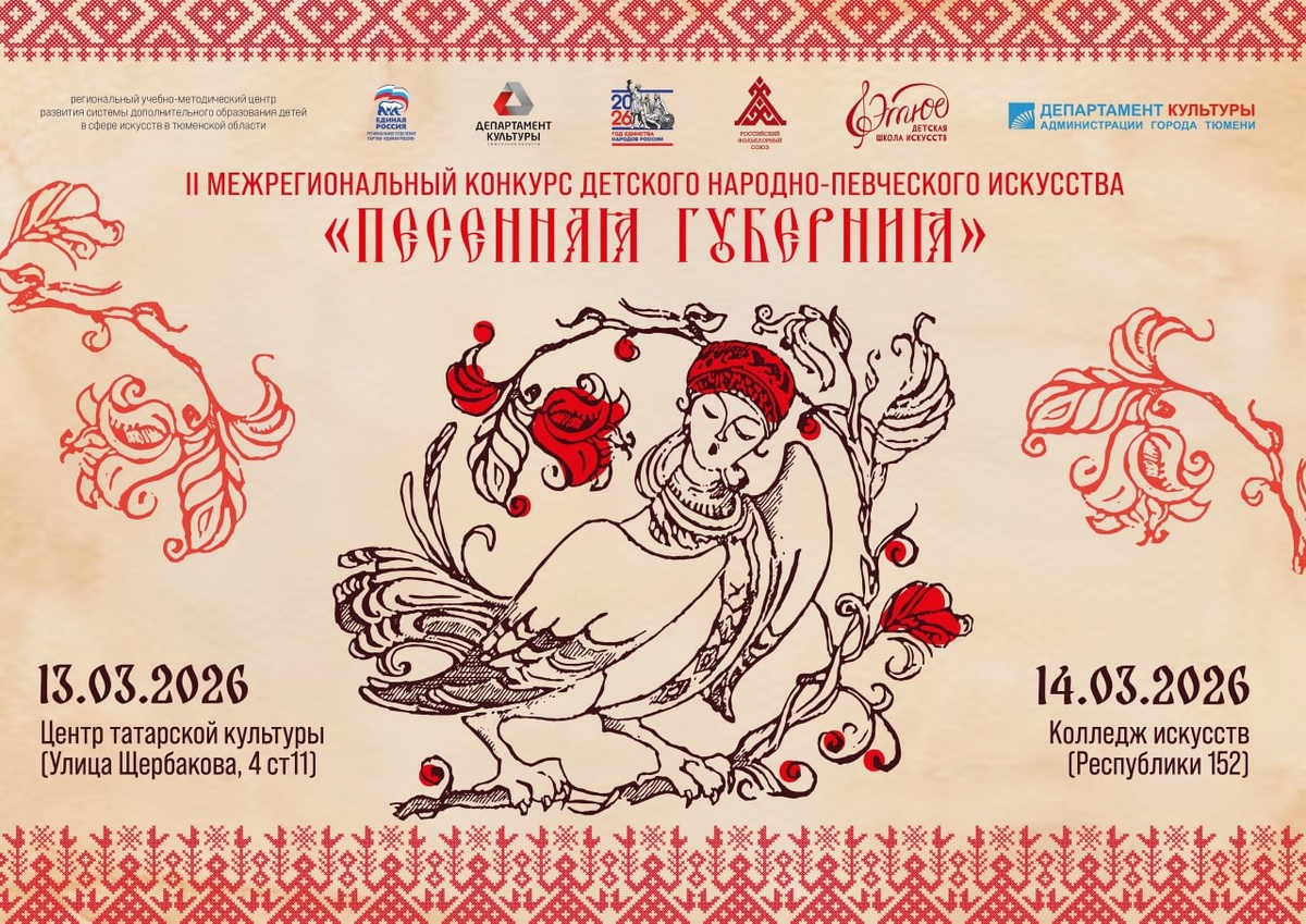 » 13 и 14 марта, город Тюмень С Положением, составом жюри и программой можно ознакомиться на сайте конкурса! Сайт: pesen-gub.tilda.ws/ Заявка: https://docs.google.com/forms/d/e/1FAIpQLSdjKpUDJKswwME5tTdm-FaiTr_Bqyz3Sb1PnConUkAtS-U-oQ/viewform?usp=header Мы ждем вас на празднике традиционной песни! По информации организаторов