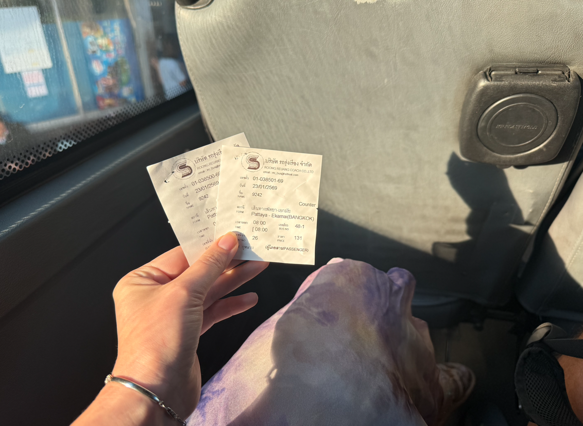 Самый простой (ну и самый дорогой) способ добраться из Паттайи в Бангкок - такси. Проезд в одну сторону стоит около 1300-1500 бат (3550 - 4100 р примерно), для меня это показалось нерациональным расходом. Поэтому за день до отправления в Бангкок мы заехали на Северный Автовокзал Паттайи и купили билеты заранее. На автобусе стоимость проезда за одного - 123 бата. 262 бата за двоих - 720 рублей примерно. Жаба (которая обычно душит) довольно поквакивала и хлопала в ладошки😃