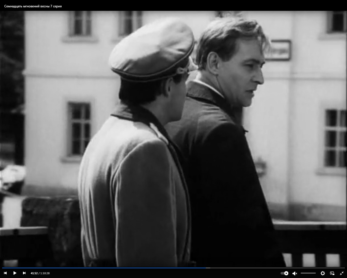 Дальше идет фильм в фильме. Маленький сюжет не влияющий на общую картину. Маленький законченный спектакль, который можно показывать как отдельное произведение. Это беседа Штирлица с генералом в поезде. Блистательный вахтанговец Николай Гриценко выдал полный спектр своего актерского искусства. Ничего не могу сказать, можно только восхищаться. В фильме эта сцена дольше и глубже, чем в повести.
