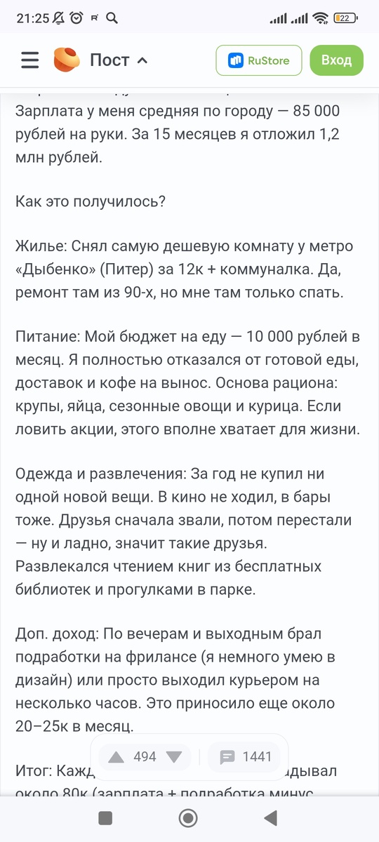 25-летний молодой человек из Петербурга рассказал на Пикабу, как с зарплатой 85 тысяч рублей за 15 месяцев собрал 1,2 миллиона рублей и внёс первый взнос по ипотеке на студию в строящемся доме. Что тут началось! В обсуждениях буквально взрыв.