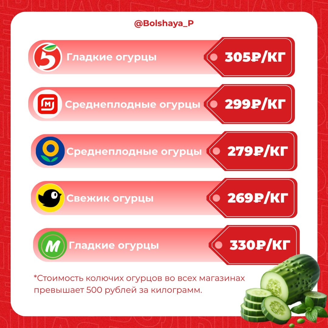 В сетевых магазинах стоимость самых дешевых свежих огурцов приблизилась к 300 ₽ за килограмм, а колючих огурцов — перевалило за 500₽ за килограмм. URA.RU сравнило цены в пермских магазинах на подорожавшие овощи — смотрите в карточке. Интересно, что месяц назад гладкие огурцы стоили менее 200₽ за килограмм, а колючие порядка 300-350 рублей. ❤️ Подписаться | Предложить новость | Дать «буст» | Мы в MAX