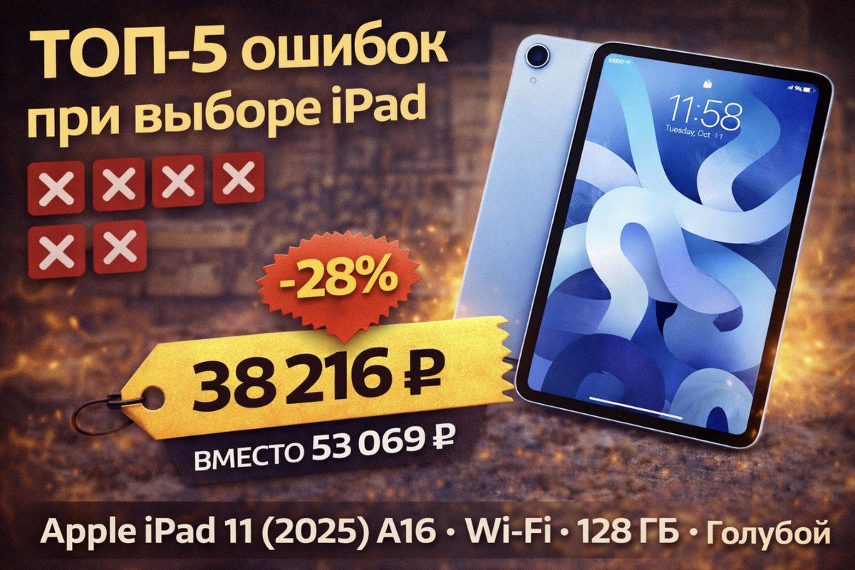 Но именно поэтому люди ошибаются — переплачивают за ненужное или берут не ту конфигурацию и потом докупают/меняют. Разбираю 5 самых частых ошибок на примере Apple iPad 11 (2025) A16, Wi-Fi, 128 GB, Blue, который сейчас стоит 38 216 ₽ (старая цена 53 069 ₽). 64 ГБ в 2025 году заканчиваются быстро: приложения, фото, кеш, офлайн-видео. ✅ Как правильно: 128 GB — это комфортный минимум “чтобы не думать каждый месяц”, особенно если планируете использовать iPad долго. Многие покупают Pro “на будущее”, а используют: браузер, YouTube, учебу, заметки и мессенджеры. ✅ Как правильно: если вы не делаете тяжёлый монтаж/3D/проф.графику, базовый iPad часто закрывает 90% задач — и экономит десятки тысяч. Для дома Wi-Fi версии обычно достаточно. Для постоянных поездок и работы “в полях” может понадобиться LTE/5G. ✅ Как правильно: если интернет раздаёте с телефона — Wi-Fi версия логична и дешевле. Частая ситуация: iPad