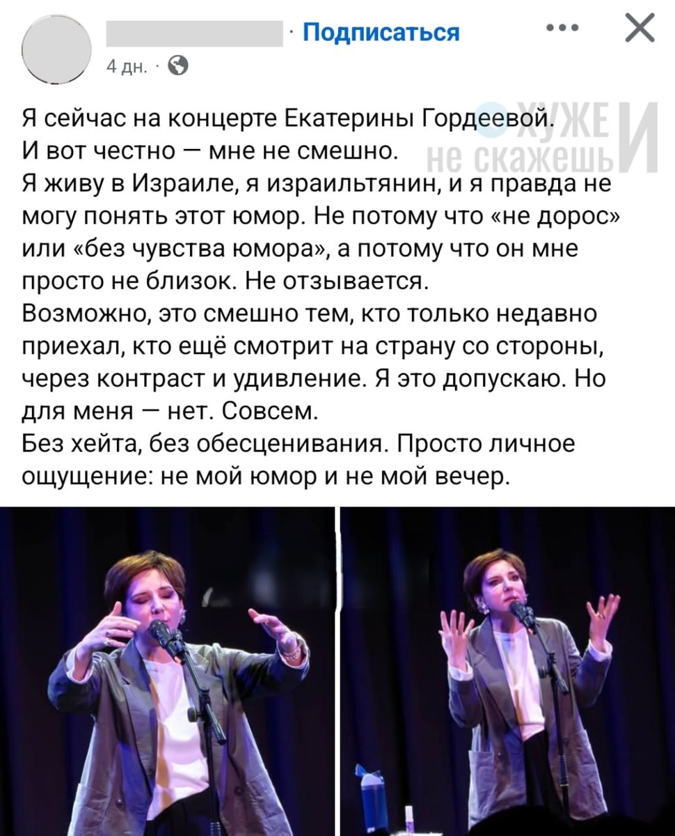 Концерты российской журналистки и телеведущей Катерины Гордеевой, признанной в России «иностранным агентом», стали неожиданной сенсацией — но не той, которую она, вероятно, надеялась создать. В Израиле, где тысячи русскоязычных репатриантов ищут не только убежище, но и культурную связь с родиной, её выступления превратились в скандал, вызвавший массовое покидание залов, публичное негодование и резкую критику даже со стороны тех, кто ранее относился к ней с симпатией. Порнография вместо юмора На концерт в зале «Карнеги» в Тель-Авиве собралась аудитория из более чем 800 человек — в основном пожилые репатрианты, бежавшие из России после февраля 2022 года. Многие приехали с детьми и внуками, надеясь на тёплый, умный, светлый вечер, напоминающий о «доброй старой» русской культуре. Вместо этого — они получили шоу, которое один из зрителей описал как «совмещение паб-комедии с порнографическим скетчем». Гордеева, известная в России как автор острых, но часто абсурдно-игривых эссе и передач, в