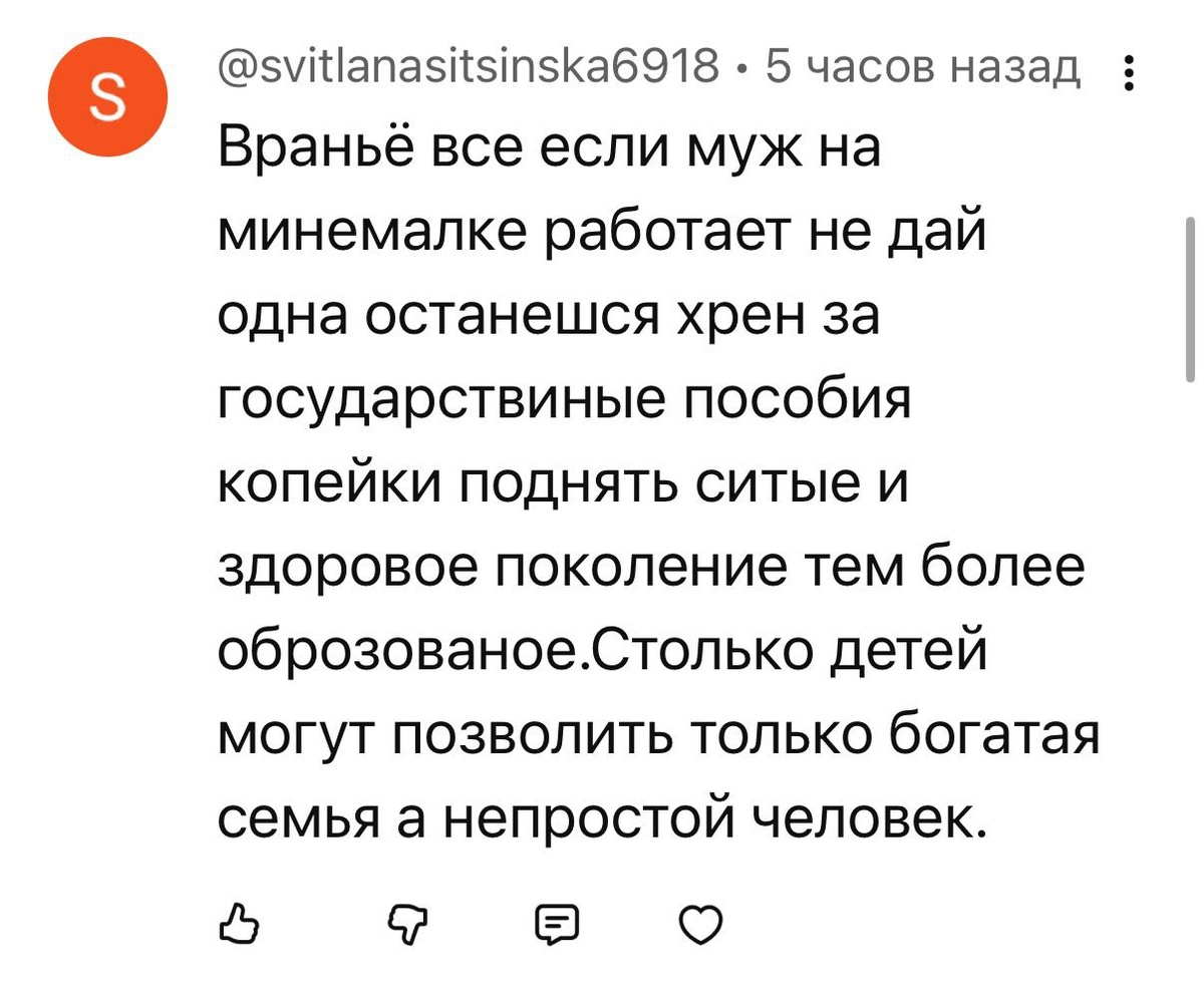 А с другой стороны, как еще понять неприязнь к многодетным, когда ЕЖЕДНЕВНО видишь такие комментарии в свой адрес? А тут всё наглядно и понятно: милости не жди! Рожаешь — будь проклята, не рожаешь — тоже...