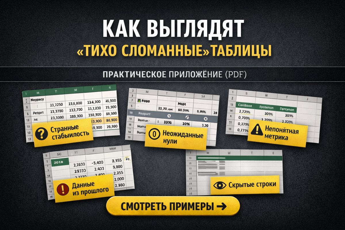 Excel не ломает работу. Он делает вид, что всё в порядке. Почему таблицы чаще всего не ломаются, а просто перестают быть надёжными — и как это происходит незаметно. Таблица была аккуратной. Формулы протянуты. Итоги сходились. Ни одного предупреждения. Ни одной ошибки. Можно было закрыть файл и идти дальше. Именно так обычно и делают. Но почему-то решение по этой таблице принимать не хотелось. Не потому что были сомнения в расчётах. Не потому что Excel показал ошибку. А из-за ощущения, которое сложно сформулировать. Как будто всё слишком ровно. Эта ситуация знакома почти каждому, кто работает с цифрами регулярно. Когда ты смотришь на файл — и вроде бы не к чему придраться, но внутренне не доверяешь результату. И чаще всего в этот момент мы делаем неправильную вещь. Мы начинаем искать ошибку. Проверяем формулы. Сравниваем суммы. Смотрим, не съехали ли диапазоны. Иногда даже пересчитываем вручную. И если ничего не находится — выдыхаем. Значит, всё нормально. Но проблема в том, что в таки