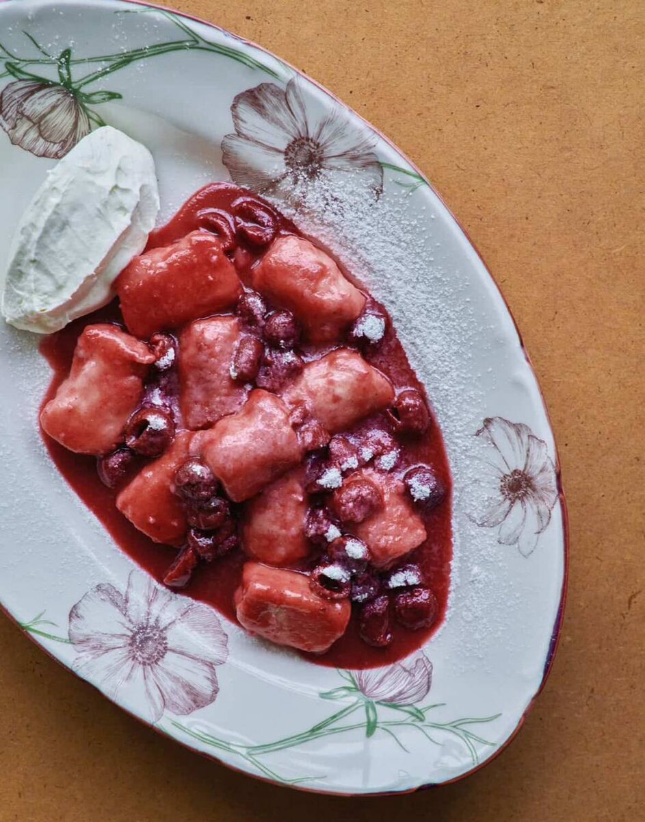 Красота: ленивые вареники с вишнево-брусничным киселем и сметаной в from Berlin.