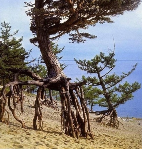 История мужчины из Мышкина Я с группой единомышленников, любителей природы, путешествовал по прибайкальским горам. Среди прочего нас интересовали и знаменитые шагающие, или ходульные, деревья, которые растут на берегах Байкала. Посмотреть на них, наряду с другими природными красотами - об этом мы мечтали, отправляясь в путь, ведь байкальские деревья на корнях-ходулях уникальны для наших лесов. Как мы знали из литературы, «деревья растут на песчаных грунтах рядом с озером, которые со временем выдуваются ветрами, что приводит к оголению корней на несколько метров». Вот этот феномен нас и привлек - узнав от бывалых людей расположение одной такой рощи «шагающих деревьев», мы арендовали лодку с мотором и по воде отправились в нужную бухту. Вылезли на берег, вскарабкались по песчаным склонам. Вид был действительно завораживающий - сосны и лиственницы на двухметровых корнях-ходулях напоминали древесных великанов из волшебной сказки. Пораженные, мы ходили в этой удивительной роще, как вдруг кт