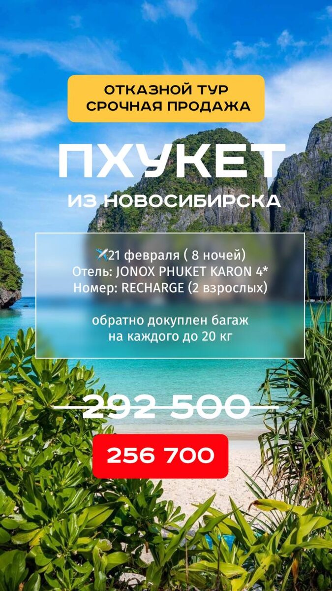 : ✈️Новосибирск-Пхукет 21 февраля на 8 ночей Отель: JONOX PHUKET KARON 4* номер RECHARGE ( 2 взрослых) обратно докуплен багаж на каждого до 20 кг Цена: 256 700 руб. По вопросу приобретения тура обращайтесь по телефону +7 (381) 237-80-96