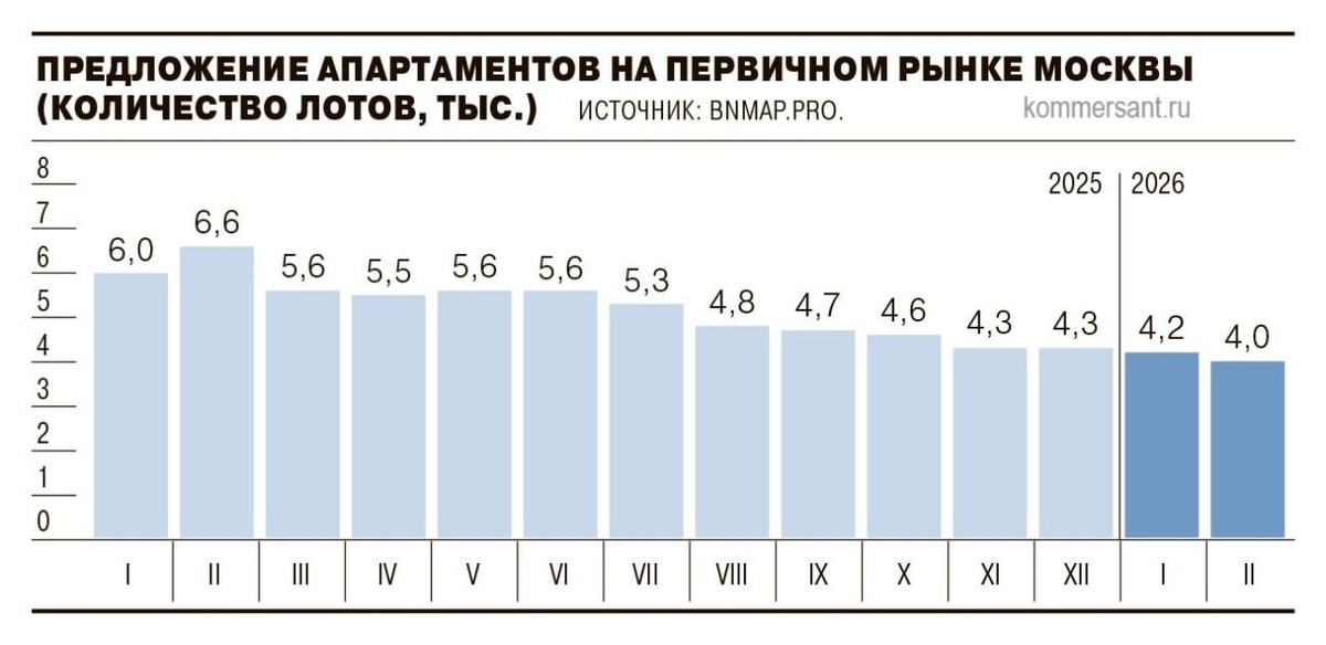 % Объем предложения апартаментов в старых границах Москвы снизился до 4 тыс. лотов (−38% г/г). 🔵По оценке экспертов, падение составило 39% — до 2,9 тыс. объектов. Это минимальный уровень с 2017 года. Сильнее всего просел массовый сегмент: 🔵 стандарт и комфорт — -55% (до 1 тыс. лотов) 🔵 элитный класс — -39% (217 лотов) 🔵 премиум — -37% (301) 🔵 бизнес — -22% (2,5 тыс.)