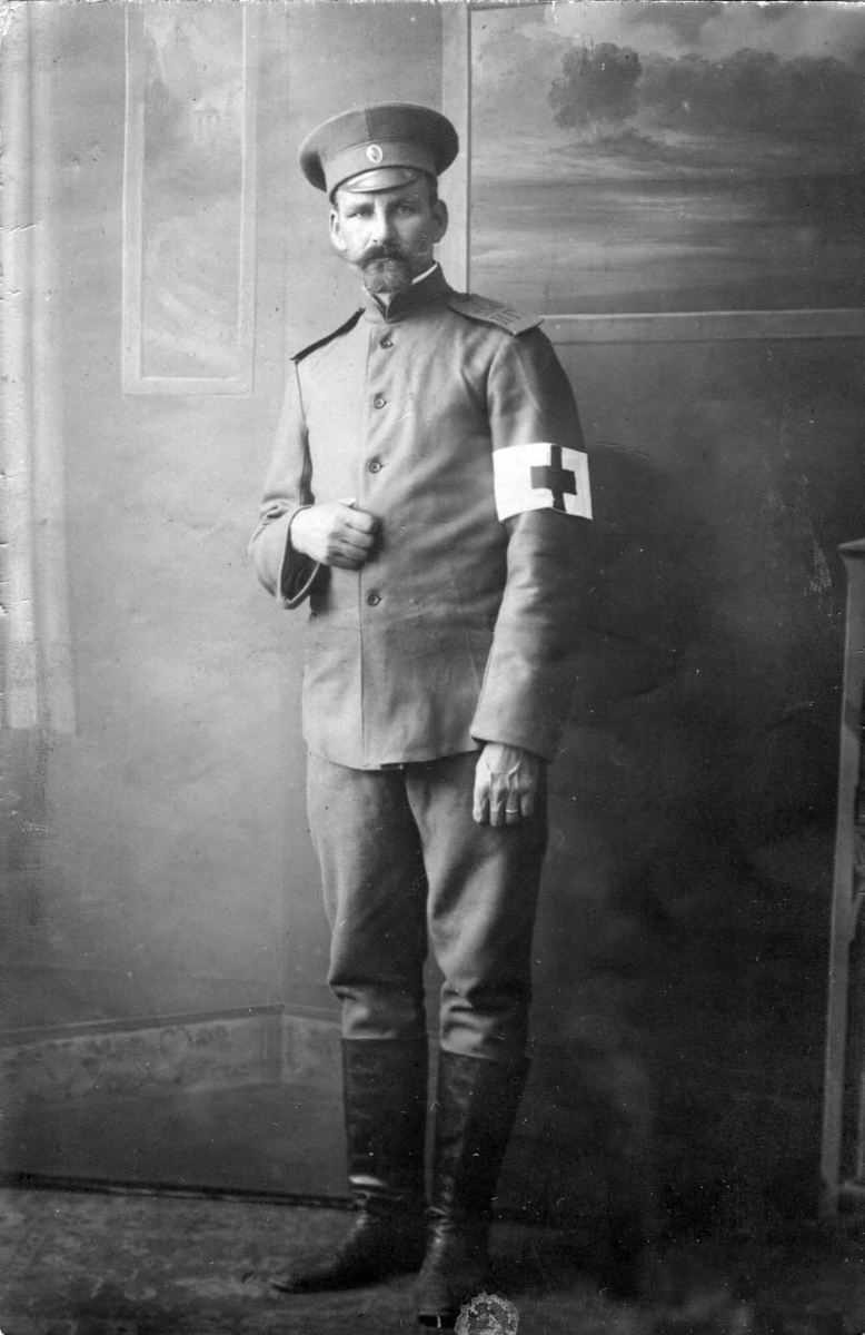 На фотографии служащий 334 полевого госпиталя с повязкой с красным крестом.