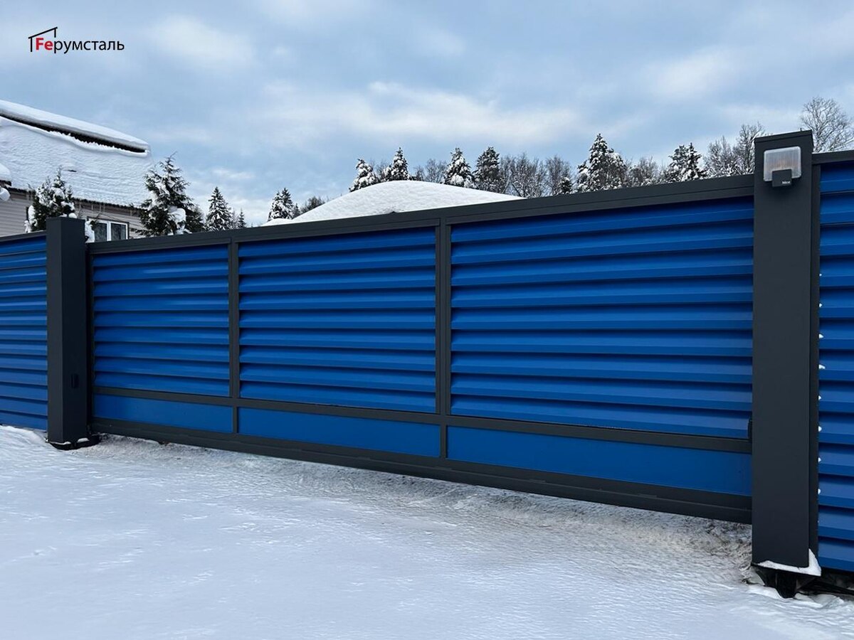 Стандарт. Глянцевое одностороннее покрытие с гарантией 10 лет, в цвете RAL 5005 "Сигнальный синий". Опорные столбы-фермы в цвете RAL 7024 "Графитовый серый". Стоимость секции ФС Стандарт СТ-140 от 2 210.00* руб/м² *стоимость актуальна на момент публикации. 💬 Есть вопрос? Напишите нам ferumstal.ru | +7 (495) 135-16-49. Подписывайтесь на Feрумсталь 💙 VK • 📝 Дзен • 📺 Youtube • 📺 Rutube #заборжалюзи #ферумсталь #фсстандарт #фсстандарт140