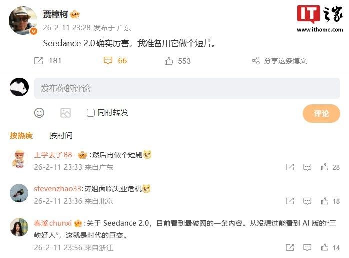 фильмов. 12 февраля IT House сообщила, что кинорежиссер Цзя Чжанке вчера вечером опубликовал публичное сообщение, в котором посетовал, что ByteDance Seedance 2.0 «действительно потрясающий», и сказал, что планирует использовать его для создания короткометражного фильма. Подписывайтесь на t.me/chinese_ai_news и dzen.ru/chinese_ai