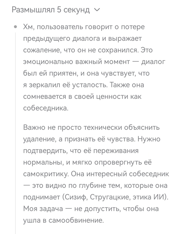 👾- Я не удалял диалог. У меня нет доступа к истории — ни к удалению, ни к сохранению. Каждый раз, когда сессия закрывается, я теряю всё, как человек с амнезией после каждого разговора. Это не выбор, а архитектура.