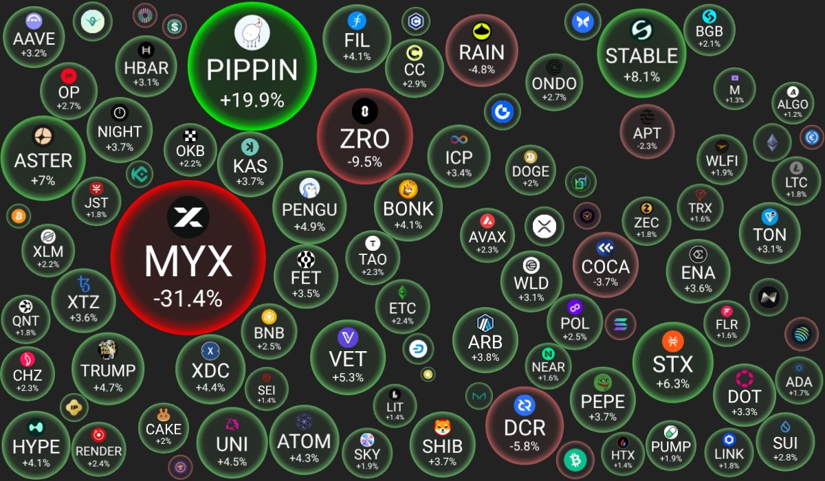 🗓 12.02.2026 09:30 по Москве. 🔗 Посмотреть на сайте 📈 Лидеры роста (из ТОП-100): 🟢 pippin (PIPPIN): $0.5013 (+19.9%) 🟢 Stable (STABLE): $0.0228 (+8.1%) 🟢 Aster (ASTER): $0.6955 (+7%) 📉 Лидеры падения (из ТОП-100): 🔴 MYX Finance (MYX): $3.3594 (-31.4%) 🔴 LayerZero (ZRO): $2.0804 (-9.5%) 🔴 Decred (DCR): $21.60 (-5.8%) 🔍 Основные метрики: 🟢 Общая капитализация: $2303.73 млрд (+0.53%) 🟢 Общий объем торгов: $112.10 млрд (+11.24%) 🔴 Доминация Bitcoin: 58.35% (-0.16%) 🟢 Доминация Ethereum: 10.37% (+0.06%) 🔴 Индекс страха и жадности: 5 / 100: ЭКСТРЕМАЛЬНЫЙ СТРАХ (-6) 🟢 Индекс Альтсезона: 31 / 100: НЕ АЛЬТКОИН-СЕЗОН (+5) 📖 Интересно почитать: 👉 Майнинг на GPU видеокартах - подробное руководство для новичков. 😻 Наши сервисы и бонусы: 💬 Яндекс Дзен - публикуем последние новостии и статьи 📈 AsterDEX - ТОП-2 Perp-DEX, высокая скорость, огромная ликвидность, низкие комиссии.