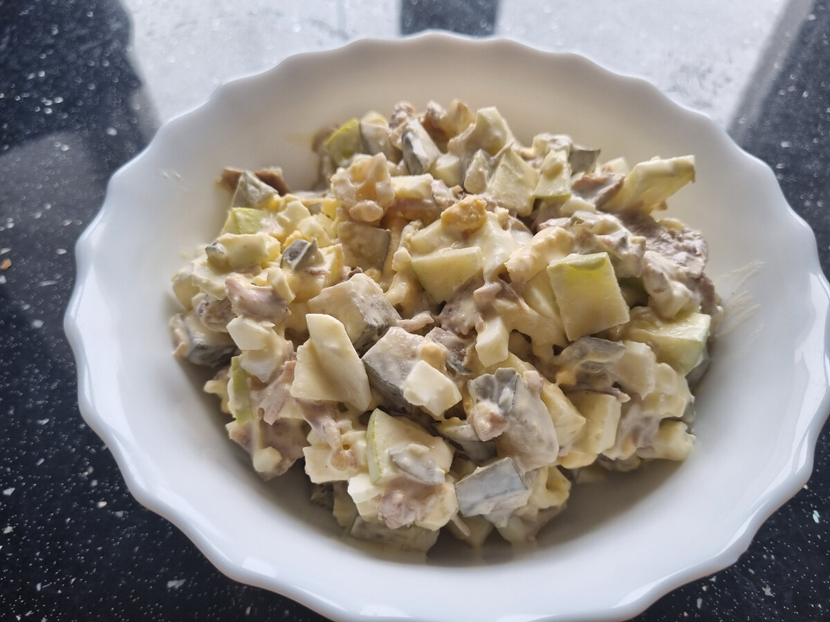 Как я давно уже говорила, я очень люблю сочетание сладкого и соленого в еде. В салатах так точно. И этот салат очень частый гость у меня на столе, потому что ингредиенты простые и очень часто они есть в холодильнике. Вы же знаете, что я считаю правильным держать в холодильнике несколько свареных яиц, отварную или запеченную курицу или индейку (ну когда как), яблоки стоят в корзинке на столе, а соленые огурцы, благодаря маме, почти всегда есть в кладовке)))) В общем я считаю, что в холодильнике должно быть что-то для быстрого перекуса. Так вот салат любимый, я бы его ела хоть каждый день))) ИНГРЕДИЕНТЫ половина отварного или запеченного куриного филе 3 отварных яйца 3 средних соленых огурчика 1 сладкое яблоко 1 ст.ложка с горкой сметаны А теперь опции: 1/2 половинка красного лука замаринованного 1/2 ч.л. горчицы к сметане для остроты соуса Итак, все режем мелким кубиком, заправляем сметаной, кушаем и наслаждаемся! Именно в этом салате у меня запеченная индейка, тоже вкусно)