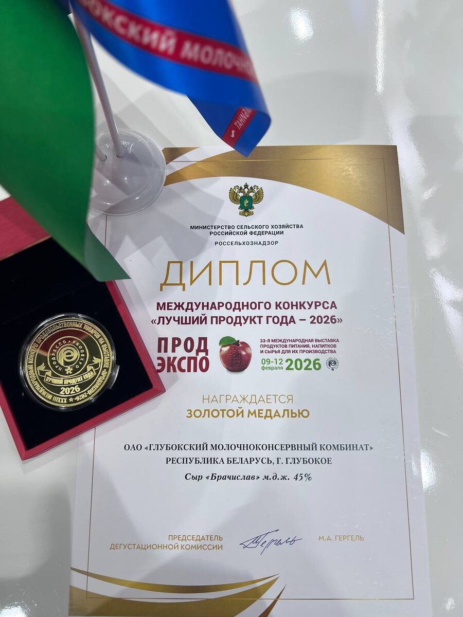 🔥🔥🔥 В Москве с 9 по 12 февраля проходила крупнейшая продовольственная выставка «ПРОДЭКСПО-2026». Во время Международной выставки продуктов питания, напитков и сырья для их производства «ПРОДЭКСПО-2026» проходил конкурс «Лучший продукт года-2026». По его результатам цех по производству сыра г. Браслав ОАО «Глубокский МКК» получил золотую медаль за сыр «Брачислав» с массовой долей жира в сухом веществе 45%, срок созревание которого составляет 180 суток. Поздравляем! 🧀