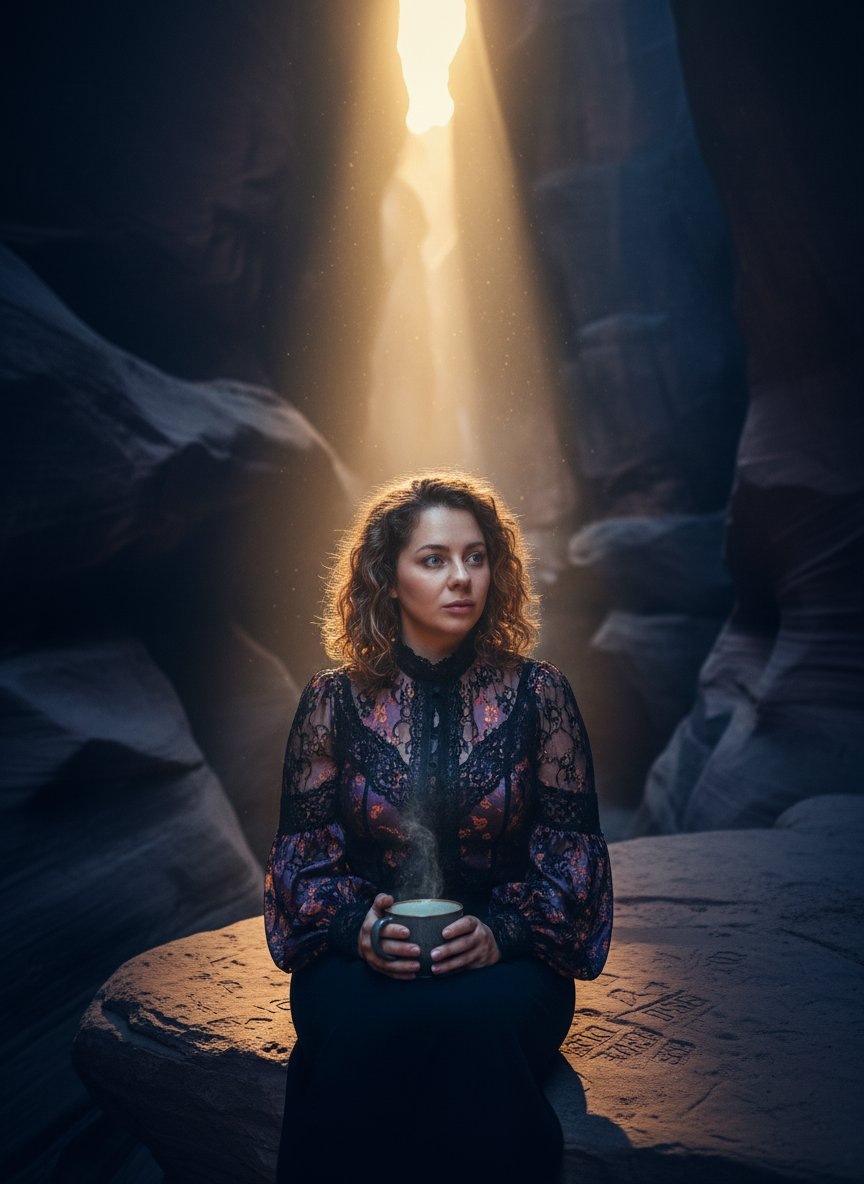 🎨 Промпт: An evocative, cinematic noir portrait of the woman from the reference photo, her facial features and likeness must remain unchanged. She is seated on a weathered sandstone ledge deep within a desert canyon at sunrise. She holds a steaming ceramic cup of coffee, its wisps of vapor catching the warm light, her expression is calm and meditative. She wears a romantic, Victorian-inspired high-neck blouse with intricate lace details and full sleeves, rendered in deep purples and soft oranges that echo the sunset palette. The scene is bathed in a blue-hour twilight atmosphere, with long shadows cast by the high canyon walls. Dramatic high-contrast lighting, telephoto compression effect flattening the layered canyon vistas behind her, enhancing the moody, mysterious sense of solitude. Golden hour light spills through a narrow crevice, illuminating dust motes in the air. Банк Промптов | Твои Идеи