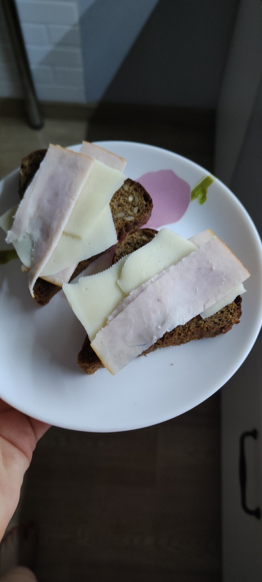 Сегодня дала себе слабину и вечером, спойлер, были полуфабрикаты на ужин. Покажу завтрак комбо такой мощный. Бутерброды с сыром и бужениной, рисовая каша с молоком и маслом