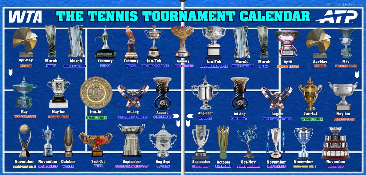 🏆 Все трофеи турниров Grand Slams, ATP/WTA 1000, Tour Finals и командных турниров в хронологическом порядке. United Cup вверху в центре. Налево — WTA, направо — ATP. Цвета турниров обозначают покрытие: трава (зеленый), грунт (оранжевый), хард (синий), индор (фиолетовый), индор/аутдор (синий и фиолетовый), и первая ракетка года (золотой). Автор говорит, что все началось, когда он рассматривал некоторые трофеи, потом решил собрать их все. По его мнению, у Australian Open самый красивый мужской трофей, а у Wimbledon — самый красивый женский. Самые некрасивые — трофеи Цинциннати, а самые скучные — трофеи Индиан-Уэллса/Майами. Самые странные: у мужчин — Paris Indoors, а у женщин — трофей Уханя. Подпишись на Эйс и точка