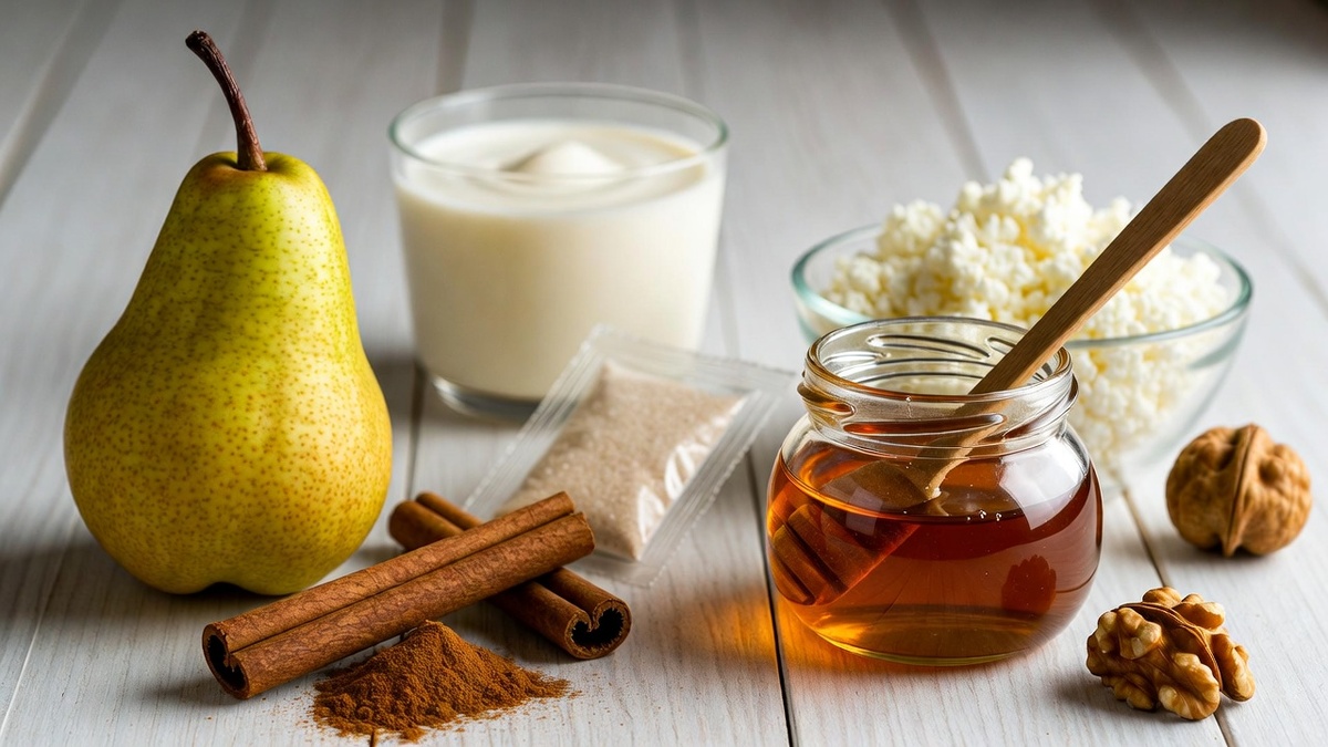 - 4. Пока груша печётся, смешай творог с йогуртом и ванилью до кремовой консистенции 🥣