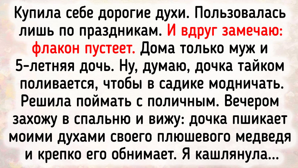 Купила себе дорогие духи. Пользовалась лишь по праздникам. И вдруг замечаю: флакон пустеет. Дома только муж и 5-летняя дочь. Ну, думаю, дочка тайком поливается, чтобы в садике модничать. Решила поймать с поличным. Вечером захожу в спальню и вижу, что дочка пшикает моими духами своего плюшевого медведя и крепко его обнимает. Я кашлянула, она испугалась и прошептала: «Мам, не ругайся... Мишка пахнет тобой, и мне тогда не страшно засыпать, когда тебя ночью нет». Духи я ей подарила.