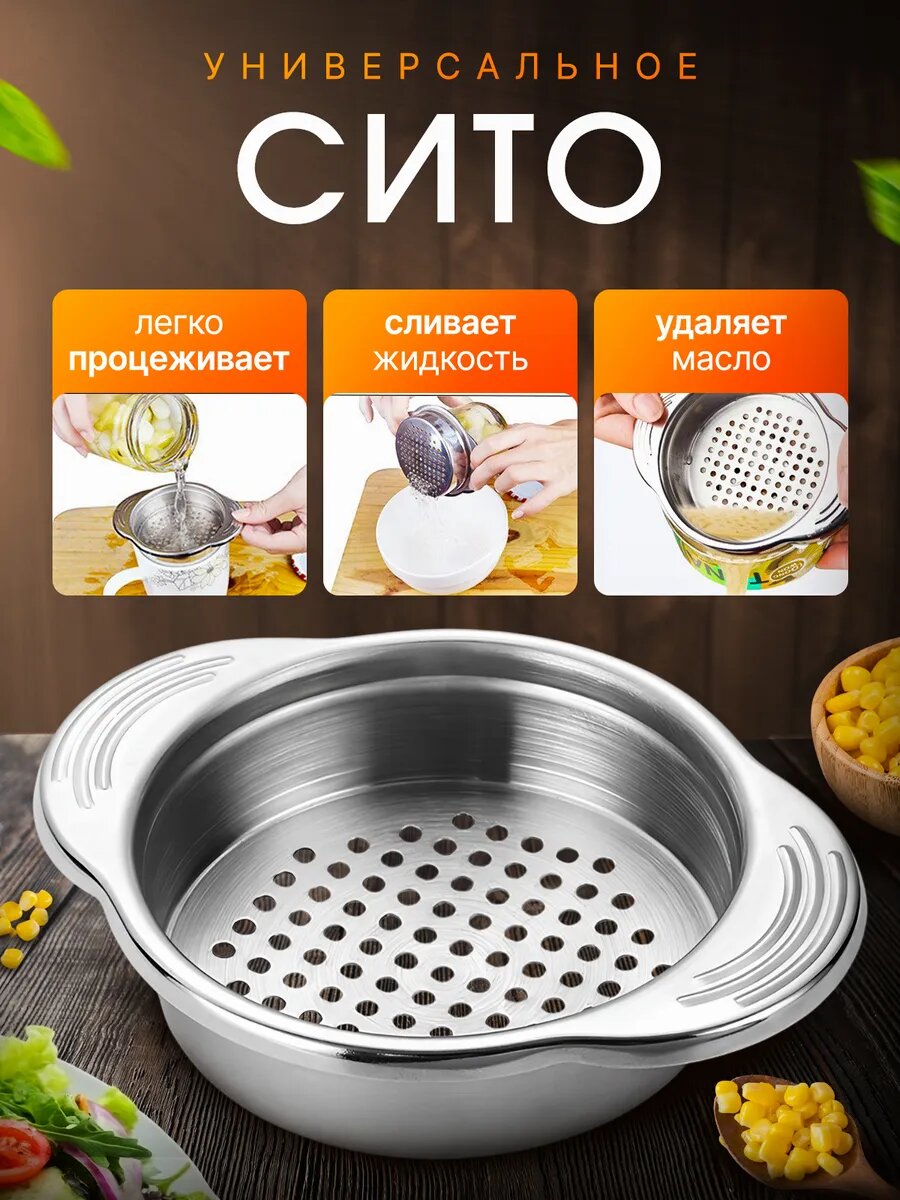 Металлическое сито из нержавеющей стали 304 — простая вещь, которой не хватает на каждой кухне. Наденьте на горлышко банки, нажмите на ручки — и масло сливается само, не касаясь рук. Никаких порезов об острые края, никаких жирных пальцев.