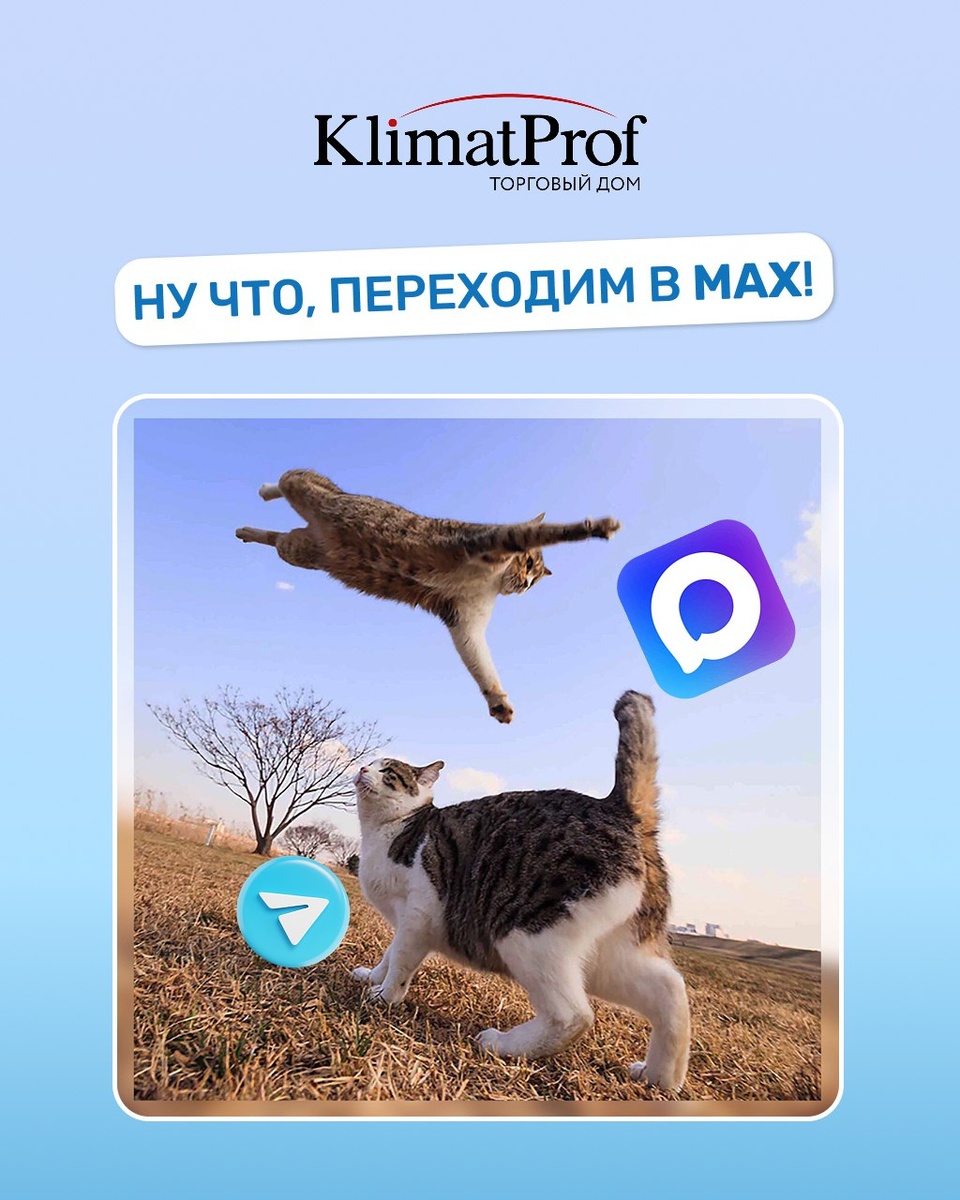 новый канал в MAX! Пока все спорят, каким мессенджером пользоваться, мы решили не выбирать сторону, а просто создать свой канал КЛИМАТПРОФ в MAX. Мы не знаем, что будет дальше с Telegram, но точно знаем, что не хотим потерять, вас — наших уважаемых партнеров! Будем рады видеть вас в MAX 🤗