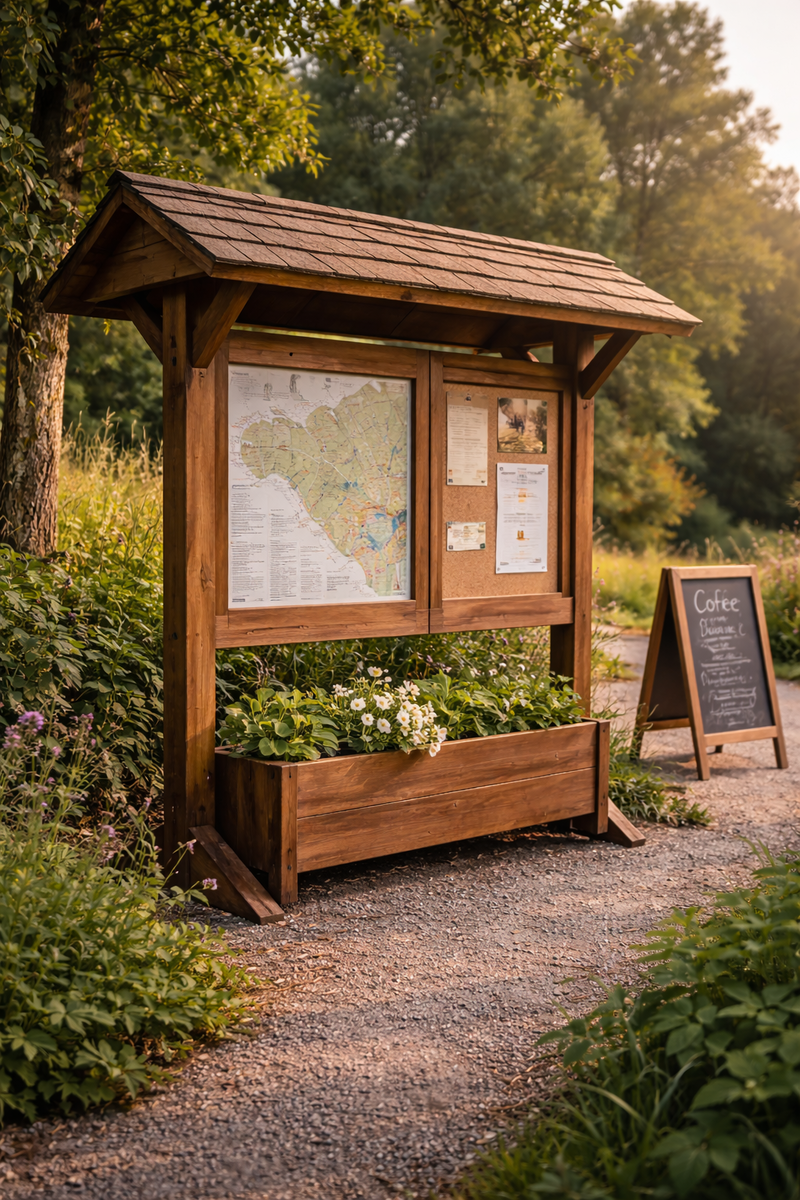 В реальности он решает сразу несколько задач: навигацию, коммуникацию с клиентом, формирование первого впечатления и визуальное позиционирование бизнеса или пространства. Именно поэтому запросы вроде «уличный стенд», «деревянный информационный стенд», «стенд для улицы» стабильно растут — их ищут не из любопытства, а под конкретную задачу. Разберём, что на самом деле подразумевается под уличным деревянным стендом, где он используется и как выбрать вариант, который будет работать, а не просто стоять. Уличный деревянный стенд — это конструкция из массива или влагостойких древесных материалов, предназначенная для размещения информации на открытом воздухе. В отличие от интерьерных табличек или POS-материалов, он: Важно: уличный стенд — это не реклама в классическом смысле, а элемент среды. По поисковым интентам и реальному использованию можно выделить несколько ключевых категорий. Используются для: Часто встречаются в парках, на