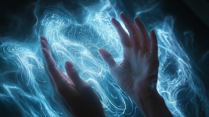 Вижу нечто невероятное: прозрачная структура, мерцающая оттенками всех цветов радуги. Границы пальцев расплылись в бесконечность светящихся потоков энергии, образуя неповторимый узор из переливающегося градиента.